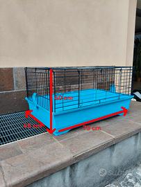 Gabbia per roditori in buone condizioni. Misure (indicate anche in foto): lunghezza 70 cm, larghezza 45 cm, altezza 40 cm. Tenuta bene ma presenta segni di usura. Meccanismi di apertura e chiusura perfettamente funzionanti.