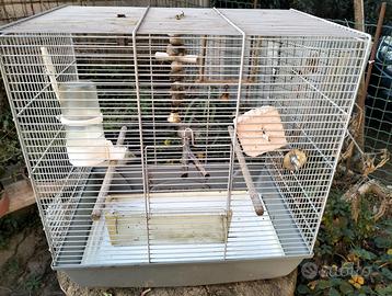 Gabbia per uccelli di piccola taglia come canarini, cocorite, fringillidi. Struttura in metallo zincato con base e accessori in plastica. Include posatoi, mangiatoie e un cassetto estraibile per la pulizia.