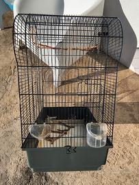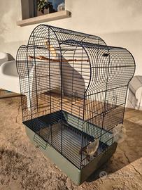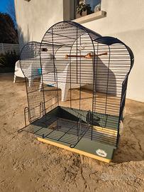 Bellissima gabbia grande per uccellini, pappagalli di colore blu scuro ed una forma tondeggiante nella parte superiore, marca IMAC made in Italy, completa di 4 mangiatoie e supporti rinforzati, grande apertura sul retro e varie aperture su tutti i lati