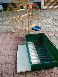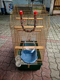 Completa di posatoi e mangiatoie, bagnetto e piccoli giochini