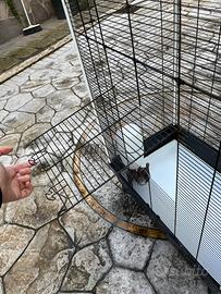 Gabbia bianco e nera, leggermente arruginita ma buone condizioni. Munita anche di mangiatoio, abbeveratoio e 3 barre di supporto per gli uccelli. Prezzo trattabile.