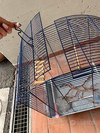 Vendo gabbia per uccellini di cm 60x50x40 circa, con tre porte (sul davanti, sul laterale e sulla parte superiore). La cedo munita di giochi, rametti, beverino e molteplici mangiatoie.