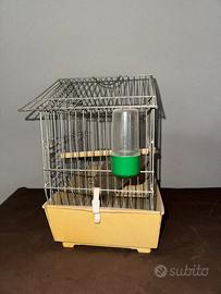 Vendo gabbia per uccelli (canarini, cocorite o simili) dalla classica forma a casetta. La gabbia è solida, pulita e pronta all'uso. Caratteristiche: • Design: Tetto a spiovente e base in plastica alta per evitare la fuoriuscita di semi. • Accessori inclusi: Beverino per l'acqua e mangiatoia interna (come da foto). • Praticità: Facile da pulire grazie al fondo sganciabile. Ottima come prima gabbia o come sistemazione secondaria/da viaggio.