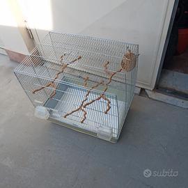 tutta sana e in buonissime condizioni,dotata di piatto di fondo estraibile, senza starla a smontare ogni volta rischiando che gli uccellini prendano il volo.