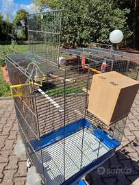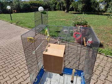 Gabbia medio/grande con piedistallo, completa di molti accessori (acquistati a parte, come stecche in legno, nido, altalena, specchio,etc), così come da foto