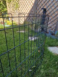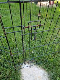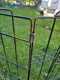 vendo recinto/gabbia in metallo per piccoli cani o altri animali (io la usavo per far stare in giardino il mio coniglio altrimenti mi mangiava tutte le piantine haha) composta da 8 quadrati da 60x60cm con uno che si apre a porticina. gia comprata usata quindi anche se l'ho usata poco presenta segni di usura e ruggine. ancora utilizzabile. solo consegna a mano perché è grande ed ingombrante