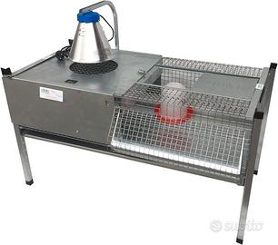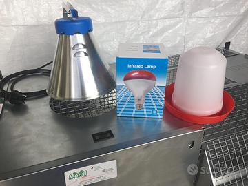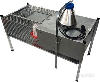 Gabbia Riscaldata Allevatrice + Gabbia Svezzamento per Pulcini/ Quaglie kit di due Gabbie per quaglie/pulcini e altri volatili composto da: 1 Gabbia per Quaglie e Pulcini da ingrasso primi giorni cm 51 x 102 x H 60. 1 Gabbia Allevatrice Pulcinaia Riscaldata accessoriata cm 51 x 102 x H 60 cm Queste gabbie sono interamente in rete è lamiera zincata, è dedicate all'allevamento di quaglie e pulcini. Misure massimo ingombro per le 2 gabbie sovrapposte : L 108 - P 60 - H 120 cm Misure utili interne cm 51 x 102 x H 25 cm rinforzo per evitare che la rete di calpestio si fletta senza aprire la gabbia Complete di ogni occorrente per il benessere degli ospiti. con doppia porta, una ad apertura totale è l'altra a ghigliottina Con gli appositi giunti in dotazione si possono sovrapporre le 2 gabbie Di serie su tutte le due le gabbie: 1 mangiatoia da appendere 1 abbeveratoio da appendere 1 padella estraibile per deiezioni Gabbia Riscaldata Allevatrice per Pulcini/ Quaglie Primi giorni. Pulcinaia con Termometro digitale La pulcinaia è indispensabile per creare un ambiente idoneo allo svezzamento di 40-50 neonati di volatili. Per proseguire nella crescita, infatti, essi hanno bisogno di stare al caldo e al riparo da correnti d'aria per almeno altri 10-15 giorni dopo la nascita. La pulcinaia è realizzata interamente in lamiera zincata di prima qualità. Il corpo allevatrice misura cm 102 x 52 x H 25 e l'altezza totale da terra è di cm 60. Il corredo comprende: 1 riflettore con porta lampada ceramicato regolabile in altezza 1 lampada rinforzata ad infrarossi da 150 Watt, 1 mangiatoia 1 abbeveratoio a sifone lt 1,5 1 padella per deiezioni. Il fondo è in rete con maglia di mm 12 x 12. Il sottofondo è estraibile per una facile pulizia.