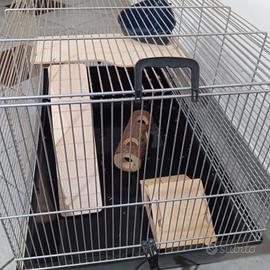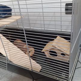 Vendo gabbia per roditori Lunghezza 70 cm Larghezza 40 cm Altezza 45 cm due accessi apribili due maniglie + Casetta in legno per roditori + Salita e ripiano rialzato + Tronco per giochi + Angolo per bagno di sabbia Era utilizzata da un criceto roborowski, enorme spazio per roditori di piccole dimensioni. Disinfettata dopo utilizzo. Seguirà ulteriore pulizia approfondita prima della vendita. Solo ritiro a mano per dimensioni complicate.
