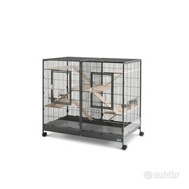 Vendo Gabbia per piccoli animali e uccelli in buone condizioni Come in foto i ripiani sono rovinati, ma perfettamente utilizzabili. Comprese anche le scalette e 8 trespoli per adattarla a voliera. DIMENSIONI: 120X65X107 CM Compresi anche arredi in buone condizioni: - Casetta in legno - Sputnik - Ruota in legno - Scalette di vario tipo - Cocco da appendere - Tubo in legno - Anelli da arrampicata - Ponte in legno - 4 Ciotoline in acciaio con relativi supporti - 1 Beverino Compresi anche griglia divisoria tra le due metà e quelle alla base, e 8 trespoli in legno. Perfetta per roditori come ratti e cincillà, ma anche per uccelli grazie agli 8 trespoli compresi PREZZO TRATTABILE