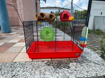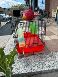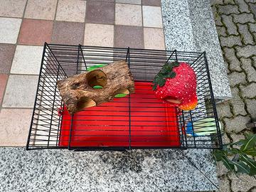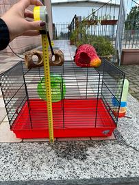 Gabbia 42x30 Completa di beverina, ruota, gioco di legno e cuccia a forma di fragola