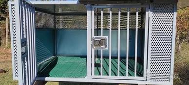 Gabbia trasporto e trasportino cani, kennel, misure ottime per furgoni o pick-up. Struttura interna di scheletro in tubolari quadrati da 2 cm ferro, pareti e divisori alluminio, vasca per raccolta liquidi, tappetino plastica di qualità sulla vasca, ottima areazione sui 3 lati e sportelli frontali in ferro con chiave di apertura e sfilabili per diminuire peso. Usata pochissimo, cedo per cambio furgone. Misure 130 larga, 100 profonda, 65 alta. Costruita artigianalmente, pagata 700. Prezzo non trattabile