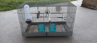 Gabbia per uccellini in metallo. Misure: circa 54,5 x 34 x 35 cm Con mangiatoie, contenitore per acqua, osso di seppia, panico. Finestrelle per inserire il contenitore-nido.