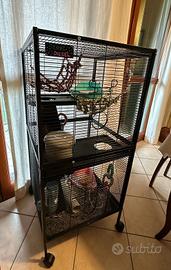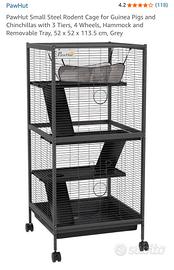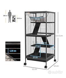 Vendo gabbia piccoli animali domestici, usata per solamente due settimane. Praticamente nuova. Aggiunti anche un dosa-acqua e un' amaca. Dettagli tecnici: Questa gabbia misura 52 x 52 x 113,5 cm ed è progettata per roditori e piccoli animali come porcellini d'India, cincillà e furetti. FACILE DA PULIRE: Grazie alle due porte, che misurano 23 x 22 cm, e al vassoio rimovibile di 52 x 49 x 4 cm alla base della gabbia, l'interno della gabbia è facilmente accessibile. 3 LIVELLI: I livelli sono costituiti da piattaforme in plastica e tre rampe di collegamento. STRUTTURA IN ACCIAIO: La struttura della gabbia è realizzata con barre d'acciaio di alta qualità, sufficientemente distanziate per garantire al tuo animale domestico una naturale circolazione dell'aria. 4 RUOTE: Si sposta con facilità grazie alle 4 ruote girevoli a 360°, 2 delle quali sono dotate di freni di sicurezza per una stabilità ottimale.