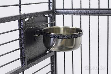 La gabbia include posatoi in legno appositamente trattati e 4 ciotole da 13 cm di diametro in acciaio per cibo e acqua.