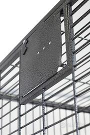 Sul lato frontale si trova la porta robusta che misura 44x94 cm e che permette al volatile di entrare ed uscire comodamente dalla gabbia. La porta si chiude con una serratura di sicurezza a chiavistello.