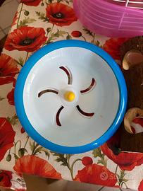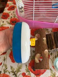 Vendo gabbia criceto completa di mangiatoia, beverino, casetta e ponte e tubo forato in legno, sabbiera wc e ruota anti rumore 18 cm .