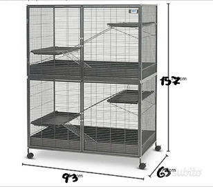 Oggetti, ripiani, ed arredi in foto sono indicativi di utilizzo e NON compresi nella dotazione qui proposta. Le 2 gabbie hanno piccole modifiche interne relative all'utilizzo per cincillà, piccoli e normali segni di ossidazione ed usura, sono perfettamente funzionanti ed in buono stato, lavate e smontate. Modello raro in italia, si può trovare a volte in vendita ad euro 500 circa ognuna, io propongo per queste usate i seguenti prezzi:
