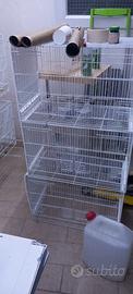 Gabbie 2gr ottimo stato, sono 24, separé chiuso e griglia, doppia griglia, spalliera retro in plastica aggiuntive, Kit voliera per disporre a voliere e corridoio volo, hanno sia i fondi in plastica che sistema carta a muro.