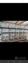 Disponibili 20 gabbie da cova da 58 cm in ottimo stato, laccate bi3, con relativi accessori e panni laterali e frontale in plastica incluso sistema carta e rulli a 700€..!!INTRATTABILE. Più disponibile 25 gabbie sempre 2gr da esposizione con sistema carta usati 3 mesi a 400€...INTRATTABILE. Spedizione eventuale a vostro carico con invio del corriere da parte vostra, io nn mi occupo della spedizione.!