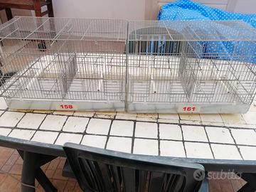 Cedesi 8 gabbie zincate da 55 cm, unificabili a coppie formando 4 gabbioni da 110 cm. Gli alloggi sono già puliti e minuti di posatoi, separatori e pannelli bianchi in forex per essere utilizzate come gabbie da 55 cm. Si cedono in blocco, no cessioni singole o parziali. Il prezzo si riferisce alla cessione nella sua totalità e non è trattabile.