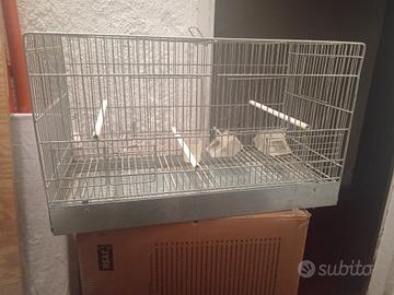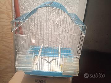 Gabbia per uccelli, specialmente per canarini, in buone condizioni, completa di accessori come da foto. Misure 56x32x27 cm