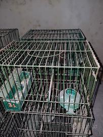 16 gabbie per uccelli da richiamo con apertura laterale. 12 in ferro di cui 1 coperta e 4 in plastica, colore verde con beverino e portasemi.