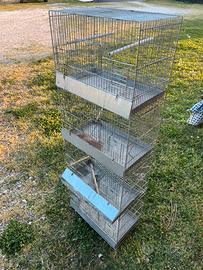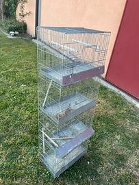 Vendo gruppo di 4 gabbiette per uccelli impilate, ideali per allevamento o per tenere più esemplari separati. Condizioni buone, come da foto. Presentano normali segni di utilizzo ma sono perfettamente funzionali. Dimensioni gabbie 38x23x27 cm Dimensione totale struttura altezza 110 cm