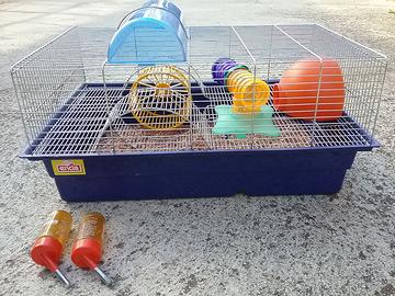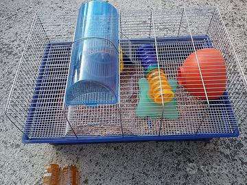 Disponibile gabbia con base blu e percorsi a tubi, accessori come in foto, larga 57cm, profonda 35cm, alta 25cm, tutto in buono stato, pulita, ottima per criceti, gerbilli, ratti, -------------euro 10