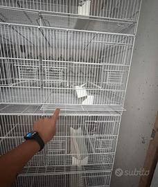 Voliere da 90x40x40 bianche 70€ , diventano batterie montate una sopra laltra, con divisori cechi diventano gabbie da 45 cm. Sono state ideate da me, e costruite da una nota azienda per fare riproduzione e poi diventare da svezzamento, con mangiatoie frontali e anche mangiatoie laterali bianche a cassetto, le voliere sono con sistema carta, No a rullo, ma a foglio di carta veloce da pulire, sono munite di posatoi e griglia fondo. 70€ a voliera cadauna, compresi di carrello . Pari al nuovo, nr 7 disponibili e 2 carrelli