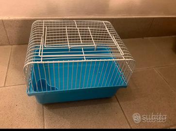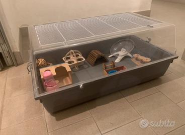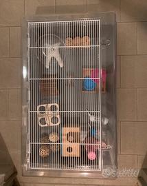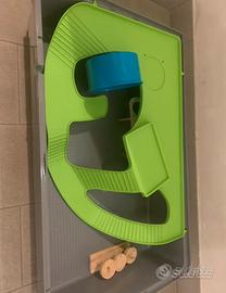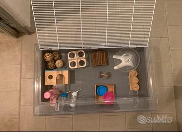 gabbietta criceto grande in plastica con chiusura superiore e con possibilitá di secondo piano con ruota, compresa di palline da gioco, labirinto, ponte in legno pieghevole, tre abbeveratoi e tre ciotole, una casetta e una "piscinetta" per la sabbia. compresa anche gabbietta di trasporto