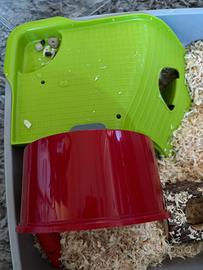 Vendo gabbia criceto nuova per inutilizzo, i giochini non sono in vendita, ruota rossa e ripiano verde SI