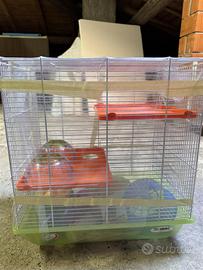 Gabbia a tre piani per criceti, completa di abbeveratoio, casetta, tubi, ruota e sfera gioco per far girare il criceto.