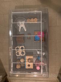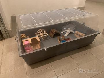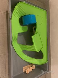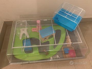 gabbietta criceto grande in plastica con chiusura superiore e con possibilitá di secondo piano con ruota, compresa di palline da gioco, labirinto, ponte in legno pieghevole, tre abbeveratoi e tre ciotole, una casetta e una "piscinetta" per la sabbia.