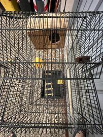 Gabbietta per uccellini con tre mangiatoi, una scaletta e una casetta dove possono deporre le uova. Gabbietta in buono stato e von prezzo trattabile