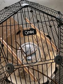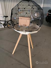 Gabbia per uccelli Geo per pappagallini, fringuelli e canarini dal design contemporaneo da togliere il fiato che ridefinisce gli standard degli habitat per uccelli. Sicura, bella e facile da pulire, con doppia apertura, mangiatoia, beverino e treppiede di legno