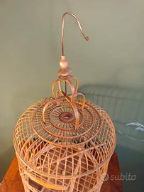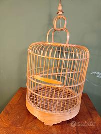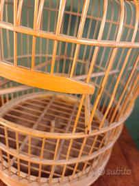 Realizzata in bambù, con apertura dello sportello verso l alto(vedi foto) e forma a cupola,culminante con gancio metallico. Posatoi orizzontali regolabili. Base lavorata con piedini sagomati. Larghezza 26 cm Altezza totale 55 cm