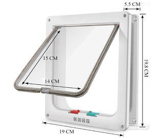 Nuova, mai usata, gattaiola per gatti da muro adatta per pareti in mattoni, porte in legno, porte in PVC metallico e può essere installata su porte e pareti con uno spessore di 2-5 cm, realizzata in plastica ABS. Dimensioni esterne: 19 x 19,8 cm(larghezza x altezza), dimensioni passaggio: 14 x 15 cm (larghezza x altezza), spessore: 5,5 cm. adatto per gatti fino a 5kg, circonferenza vita fino a 50 cm, 4 opzioni di chiusura: solo uscita, solo entrata, entrata e uscita, porta bloccata, per consentire ai gatti di entrare e uscire a loro piacimento, complta di scatolo ed istruzioni