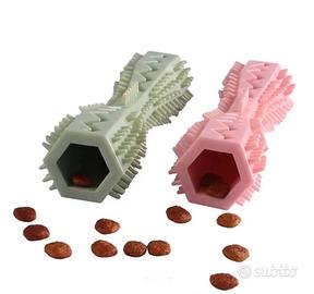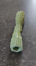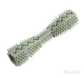 Gioco masticabile per cani in gomma morbida per la pulizia dei denti e massaggio gengive, con aperture laterali per poter inserire croccantini o altro cibo, misura 14,2x3,6 cm color verde chiaro, nuovo ad euro 3,00.