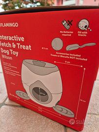 gioco per cani utilizzato una volta. quando il cane riporta la pallina, escono i premi sui vassoi laterali.