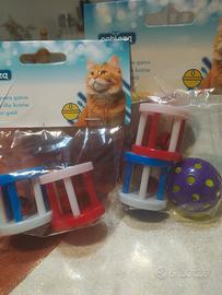 Pallina e tamburelli con campanellina all'interno. Gioco per gatti. In buone condizioni, già pacchetto aperto. Marca Nobleza. Made in china.