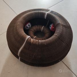 Tiragraffi in cartone ondulato, modulabile in diverse forme, compreso di 2 palline per fare giocare il gatto. Nuovo, acquistato a 17 euro, ma il mio gatto preferisce correre.