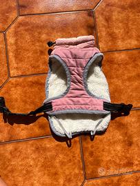 Giubbotto pettorina caldissimo e imbottito ideale per l'inverno, adatto a cani di piccola/media taglia. In tessuto rosa con interno in morbida pelliccetta bianca, bordi grigi, cintura regolabile con chiusura a clip e coulisse sul collo per una vestibilità perfetta.