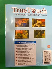 Vendo guanto spazzola TrueTouch per rimuovere il pelo morto di cani e gatti in modo rapido e delicato.