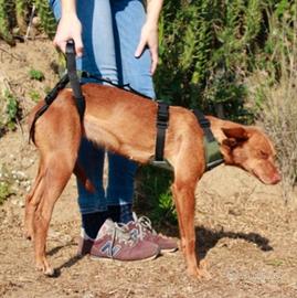 Guinzaglio a Pettorina per 4 zampe ortocanis, per cani anziani o con difficoltà motorie. Doppio aggancio per il guinzaglio più maniglia per sostenere le zampe posteriori. Usata molto poco, taglia M (vedi tabella di riferimento)