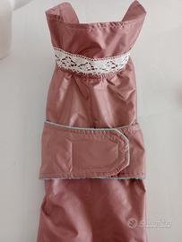 Impermeabile rosa foderato con micropeluche verde menta, inserto in pizzo di cotone sul colletto. chiusura con velcro. elastici per zampette posteriori.
