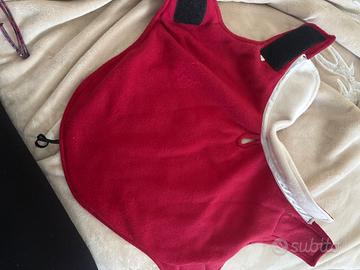 Impermeabile per cani di piccola taglia interno in pile rosso ed esterno impermeabile rosso con colletto in pile bianco, è dotato di 2 strap per adattarlo bene al cane