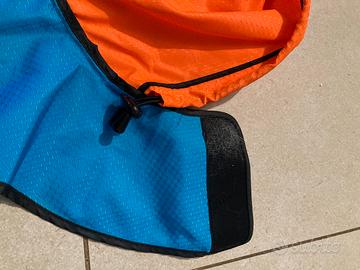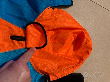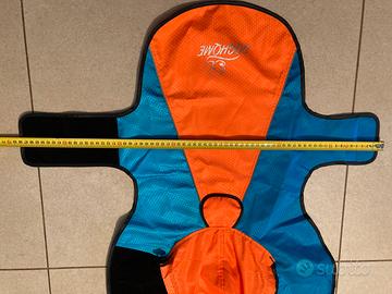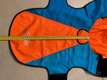 Cappottino impermeabile per cani per protezione da pioggia e vento, con cappuccio, misure regolabili con chiusura sottopancia e sottocollo in velcro, asola per aggancio guinzaglio, colori riflettenti sl buio. Nuovo mai utilizzato. Taglia M - misure Collo: da 38 a 46 cm. Giro vita: da 48 a 61 cm. Lunghezza 42 cm.