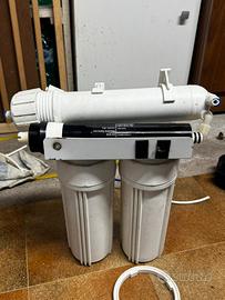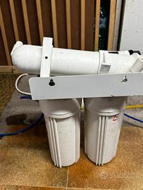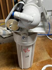 I Vendesi impianto ad osmosi inversa professionale marca FORWATER, ideale per la produzione di acqua purissima destinata ad acquariologia (dolce e marina), idroponica o uso domestico. L'impianto è strutturato su un robusto telaio in metallo e garantisce un'elevata efficienza di filtrazione. L'unità è composta da: • 2 Biccheri verticali da 10": Per pre-filtrazione (solitamente sedimenti e carboni attivi). • 1 Membrane Vessel (Bianco superiore): Contenitore per membrana osmotica standard. • 1 Post-filtro in linea (Nero): Modello FORWATER FWH-1812-150 ad alta reiezione (150 GPD), con tecnologia anti-fouling (anti-intasamento).