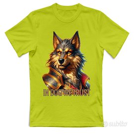 Divertente ed elegante maglietta con un lupo audace e maestoso vestito da nobile guerriero, completo di intricati dettagli dell'armatura. Perfetta per gli amanti degli animali e gli appassionati di design forti e sicuri, la scritta "In Dog We Trust", celebrando la lealtà e la fiducia nei nostri amici pelosi.