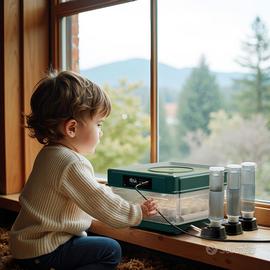 L’incubatrice include una ventola per assicurare una buona circolazione dell’aria e un foro d’aria nel coperchio per l’apporto di ossigeno fresco. Un sistema intelligente di regolazione dell'umidità permette di utilizzare una comune bottiglia di plastica piena d’acqua, che, attraverso un tubo sottile, rilascia l’acqua in modo lento e uniforme.
